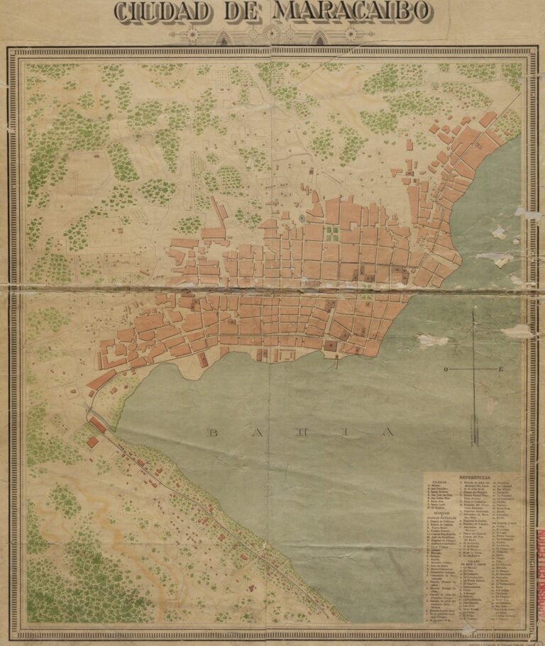 This map of the city of Maracaibo was drawn by Venezuelan Manuel S. Soto and published in 1889 by the National Printing Office of Venezuela.