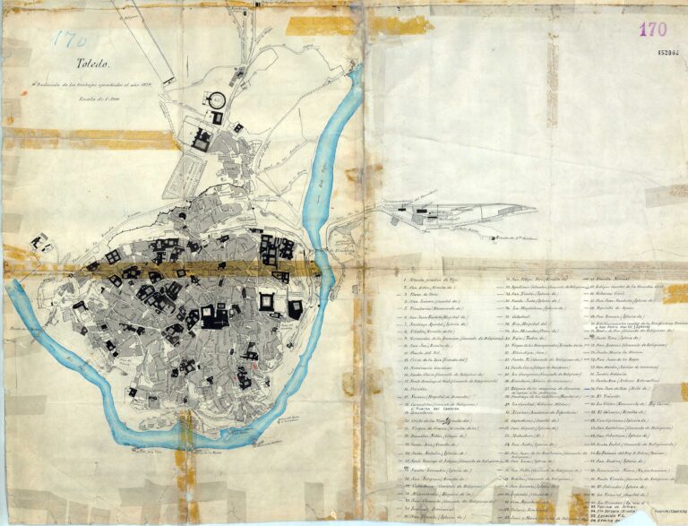 This map of the city of Toledo was published by the Geographical and Statistical Institute of Spain in 1879, by order of Colonel José Ibáñez Íbero. The original copy is currently preserved at the National Geographic Institute of Spain.