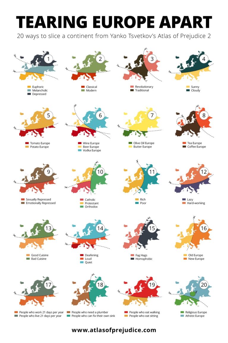 This image shows 20 maps dividing Europe according to commonly held preconceptions such as alcohol consumption, religion, cuisine and weather.