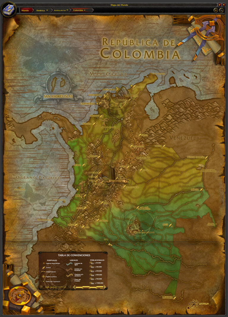 This map, created by Santiago Reyes in 2023, represents Colombia. The illustration is part of the project to represent the entire Latin America in the style of World of Warcraft.