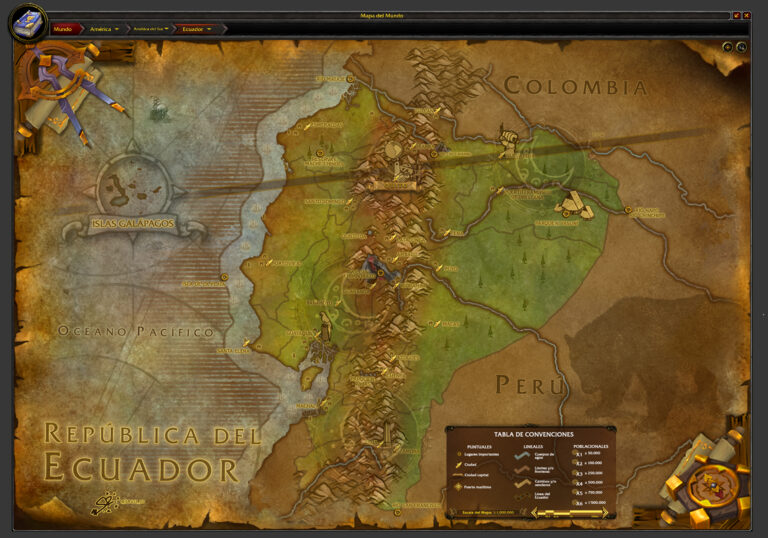 This map, created by Santiago Reyes in 2023, represents Ecuador. The illustration is part of the project to represent the entire Latin America in the style of World of Warcraft.
