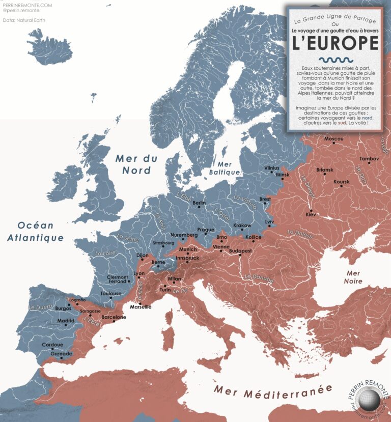 This map, published Perrin Remounted In 2024, Europe is divided into two major hydrological basins. The entire territory whose water flows into the Mediterranean Sea is shown in red, and the territory whose water flows into the Atlantic Ocean is shown in blue.