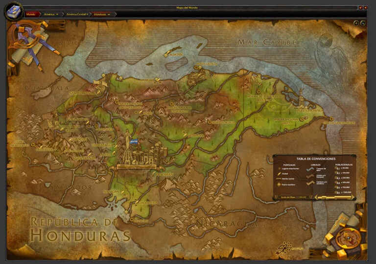 This map, created by Santiago Reyes in 2024, represents Honduras. The illustration is part of the project to represent the entire Latin America in the style of World of Warcraft.
