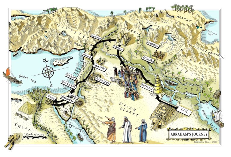 This map, created by Katherine Baxter in 2019, depicts Abraham's journey from Ur to Canaan, as described in the Book of Genesis.