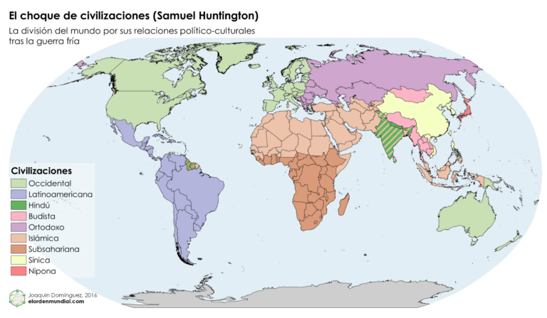 This map, created by Joaquín Domínguez for El Orden Mundial in 2016, shows the world divided into civilisations as established by Samuel Huntington in his 1996 book «The Clash of Civilisations».