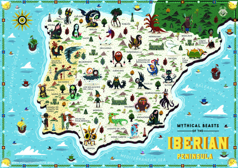This map, created by Neil Parkinson of Púca Printhouse in 2023, displays monsters from the mythology of the Iberian Peninsula.