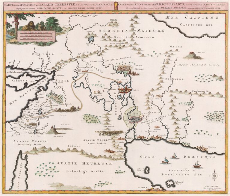 This work must be understood within its historical context. In the Age of Discovery, there was growing pressure within Christian theology to identify the exact location of Eden in order to validate the information provided in the first book of the Bible, Genesis. Thus, French bishop Pierre-Daniel Huet, using information from his predecessors, established its location and ordered the publication of this map.