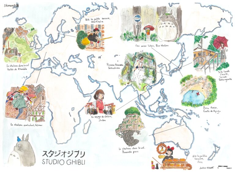 This map, drawn by Justine Vignat in 2025, showcases the world of Studio Ghibli's universe.