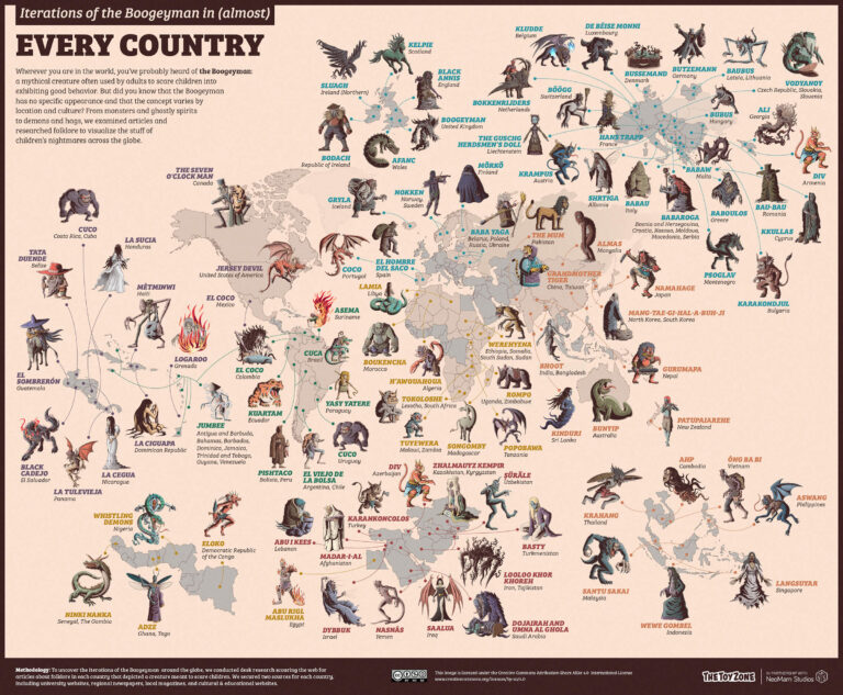 The detailed creatures are not exhaustive and focus only on the most popular ones in each country, but it is striking how this mythical figure exists consistently in virtually all cultures.