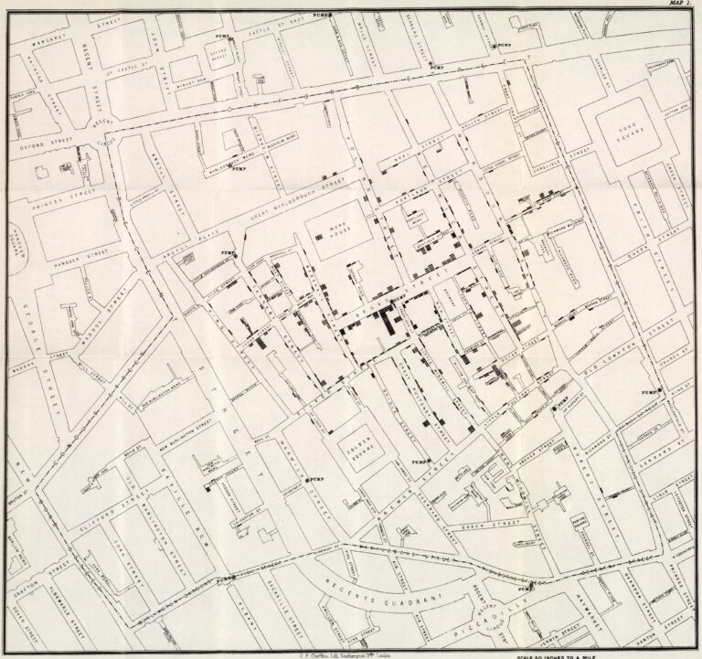 The map shows the Soho district of London, with water supplies (PUMP) marked on it, as well as the blocks where cholera deaths had been recorded. With this, John Snow was able to demonstrate that the majority of the 578 deaths were around a water supply on Broad Street.