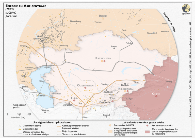The illustration covers Central Asia, focusing mainly on Kazakhstan, Uzbekistan, Kyrgyzstan, Tajikistan and Turkmenistan, although it also shows part of China and Russia, as well as neighbouring countries such as Azerbaijan.