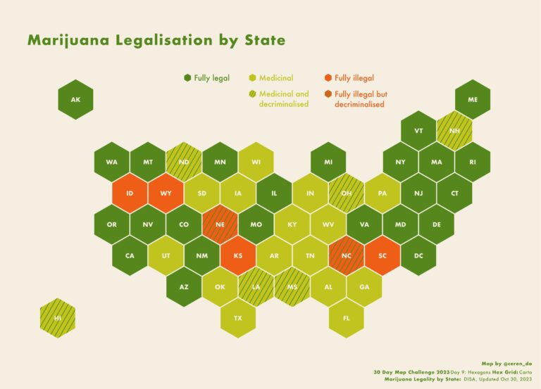 The different hexagons are painted in different colours to show the legal status of cannabis in each country (at the end of 2023):
