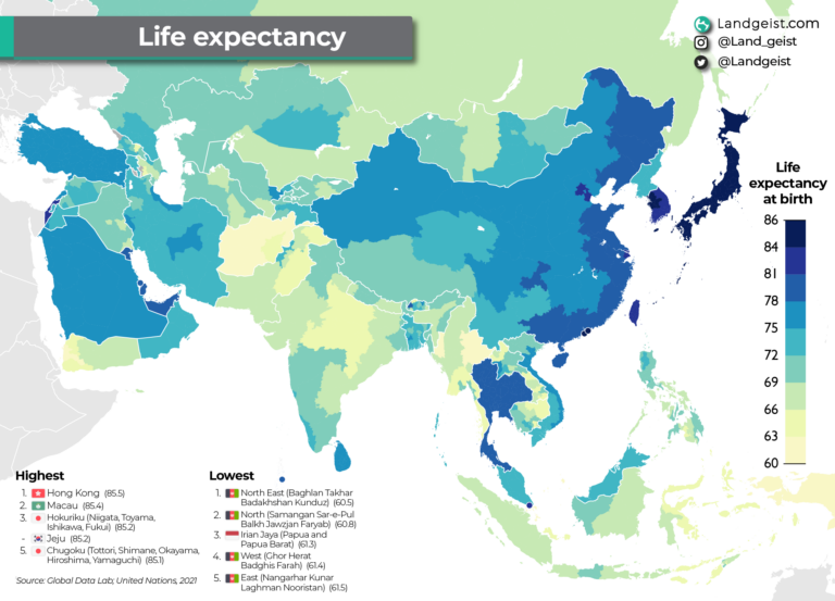 This map, created by Landgeist, shows the average life expectancy in different regions of Asia, according to data published by the United Nations in 2021.