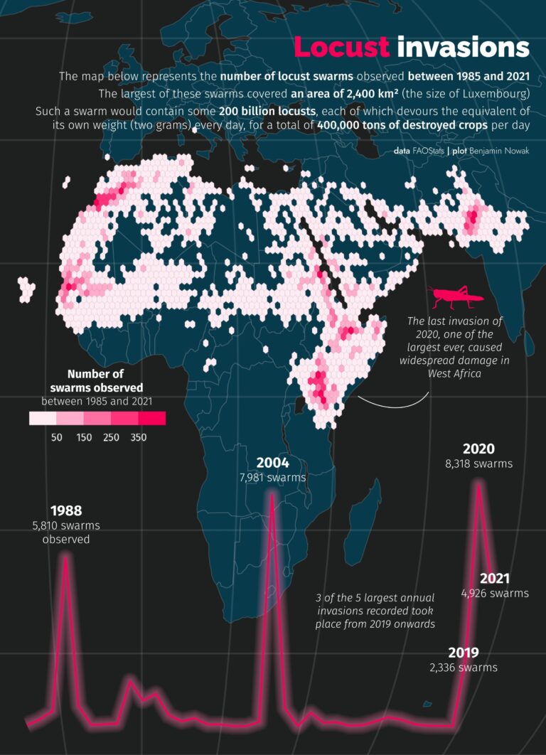 During this period, the largest swarm appeared in Kenya in 2020. At its peak, it covered 2,400 square kilometres, an area equivalent to the size of Luxembourg. It is estimated that a swarm can contain between 40 and 80 million locusts per square kilometre, meaning that this swarm could have contained up to 200 billion locusts.