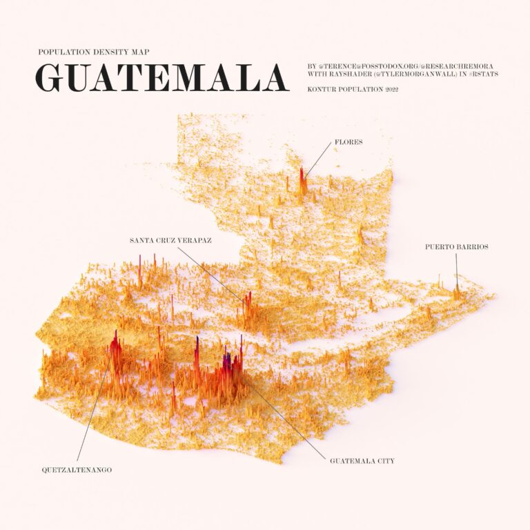 This illustration, created by Terence Teo, represents Guatemala's population density on a three-dimensional map. To do this, Terence extracted the data available at Kontur Population with which it generates columns using a programme, with a height that represents the population density at each point.
