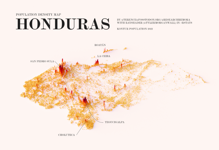 This illustration, created by Terence Teo, represents the population density of Honduras on a three-dimensional map. To do this, Terence extracted the data available at Kontur Population with which it generates columns using a programme, with a height that represents the population density at each point.