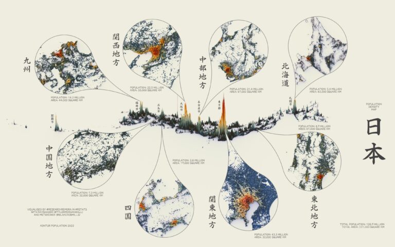 This illustration, created by Terence Teo, represents Japan's population density on a three-dimensional map. To do this, Terence extracted the data available at Kontur Population with which it generates columns using a programme, with a height that represents the population density at each point.