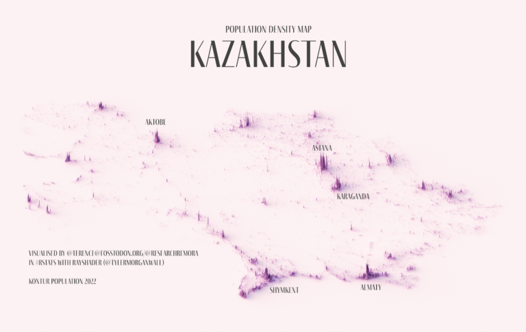 This illustration, created by Terence Teo, represents the population density of Kazakhstan on a three-dimensional map. To do this, Terence extracted the data available at Kontur Population with which it generates columns using a programme, with a height that represents the population density at each point.