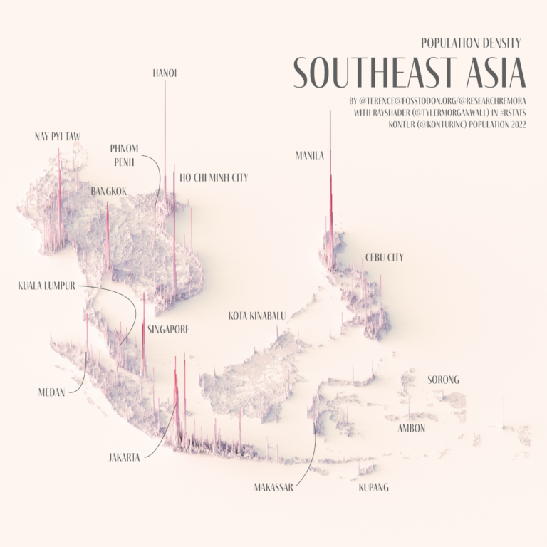 This illustration, created by Terence Teo, represents the population density in Southeast Asia using a three-dimensional map. To do this, Terence extracted the data available at Kontur Population with which it generates columns using a programme, with a height that represents the population density at each point.