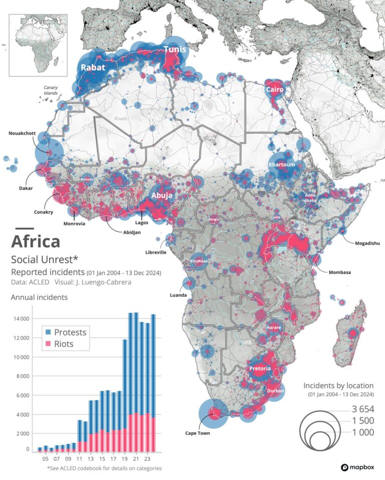 This map, published by José Luengo-Cabrera, shows the riots and protests reported in Africa between 2004 and 2024, according to data from Armed Conflict Location & Event Data (ACLED).