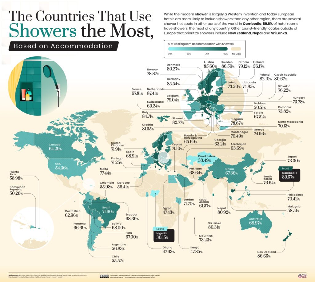 This map, published by QS Supplies in 2023, shows shower usage in every country in the world.