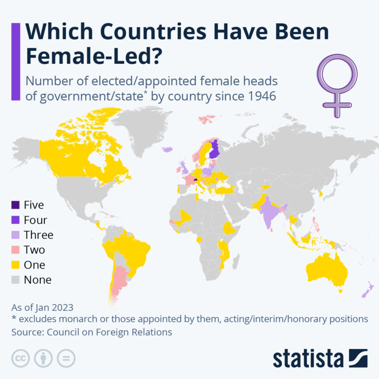 This map, published by Statista with data from January 2023, shows which countries in the world have elected women as heads of state or heads of government since 1946. The map excludes unelected positions (such as monarchs) or women who have been in a temporary position to replace someone else during a period of unavailability.