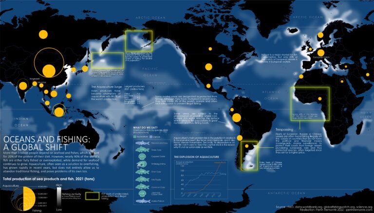 This map, created by Perrin Remounted for the website Visual Capitalist in 2023, shows fishing and aquaculture activity worldwide, according to data from various sources for the year 2022.