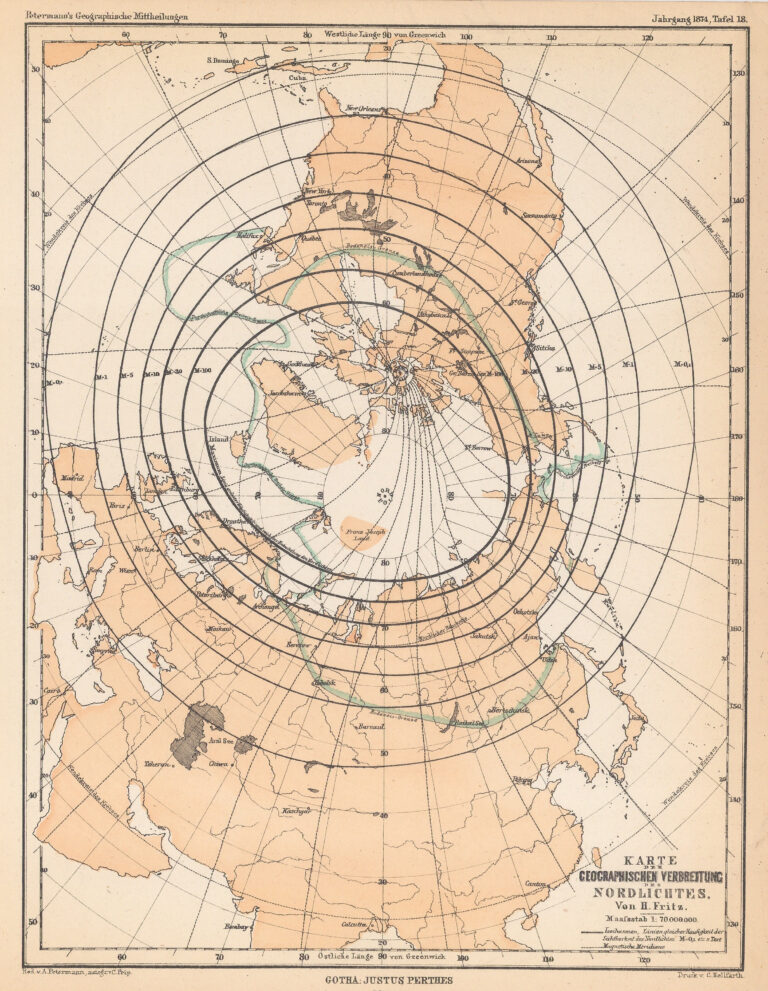This map was created by cartographer August Heinrich Petermann, using information provided by geophysicist Hermann Fritz, and published by Justus Perthes in 1874. It is one of the earliest representations of the geographical distribution of the Northern Lights.