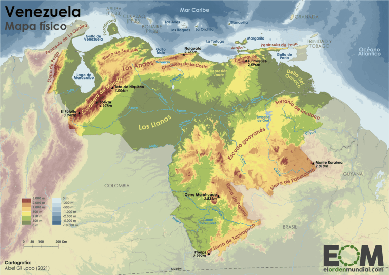 This physical map of Venezuela was created by Abel Gil Lobo for the website El Orden Mundial in 2021.