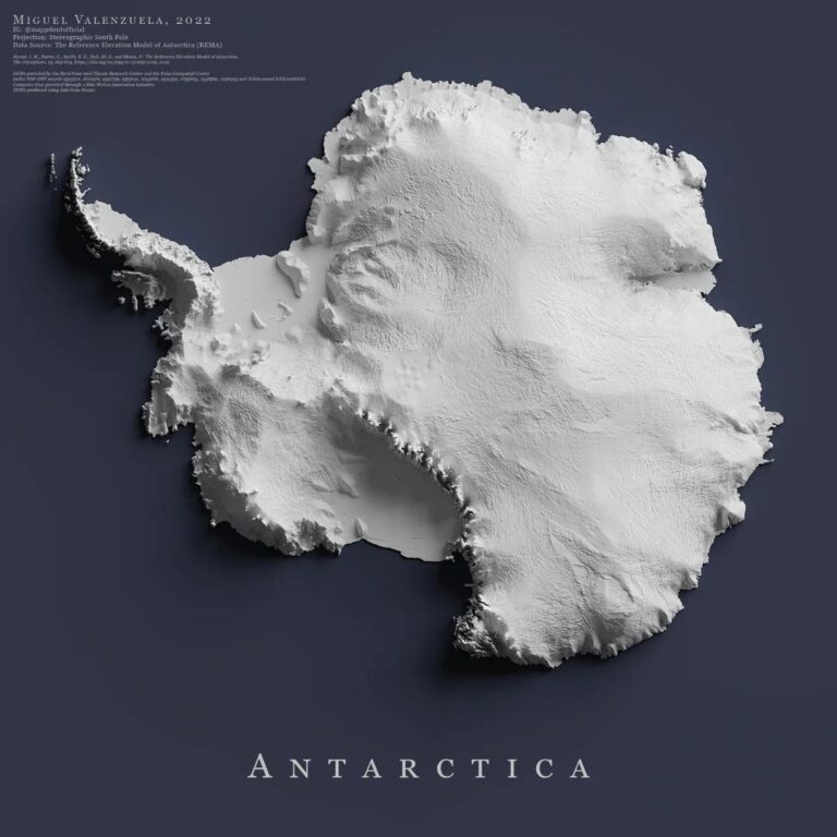 This map, created by Miguel Valenzuela, shows the relief of Antarctica. To do this, it uses only the colour white, representing the ice sheet that covers the continent. The author uses shading, which highlights the steep areas.
