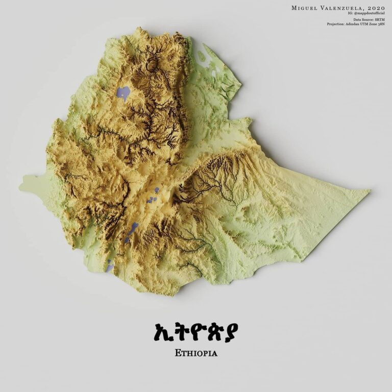 This map, created by Miguel Valenzuela, shows the relief of Ethiopia. It uses two colours: green for low-lying areas and orange for high peaks. The author also uses shading to highlight steep areas.