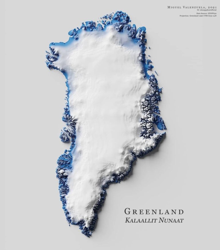This map, created by Miguel Valenzuela, shows the relief of Greenland. It uses two colours: blue for low-lying areas and white for high peaks. The author also uses shading, which highlights the steep areas.