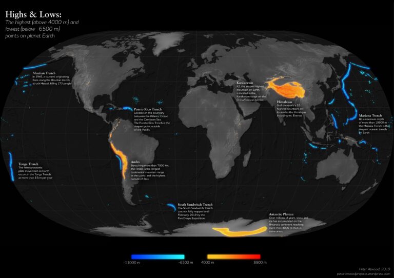 This map, created by Peter Atwood in 2019, shows the highest places on the planet, as well as the deepest trenches.