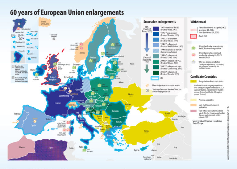 This map, created by Lucas Destrem for the Robert Schuman Foundation, shows the history and present state of European Union membership.