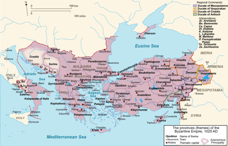 This map, created by Konstantinos Plakidas for Wikimedia Commons in 2009, shows the extent of the Byzantine Empire in 1025, upon the death of Emperor Basil II.