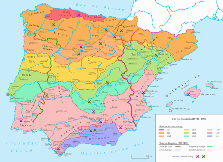 In addition, the map also marks the main battles fought between Muslims and Christians during this period, with Christian victories marked in purple and Muslim victories in green. The dates accompanying the different cities are the years in which those cities passed from Muslim to Christian control.