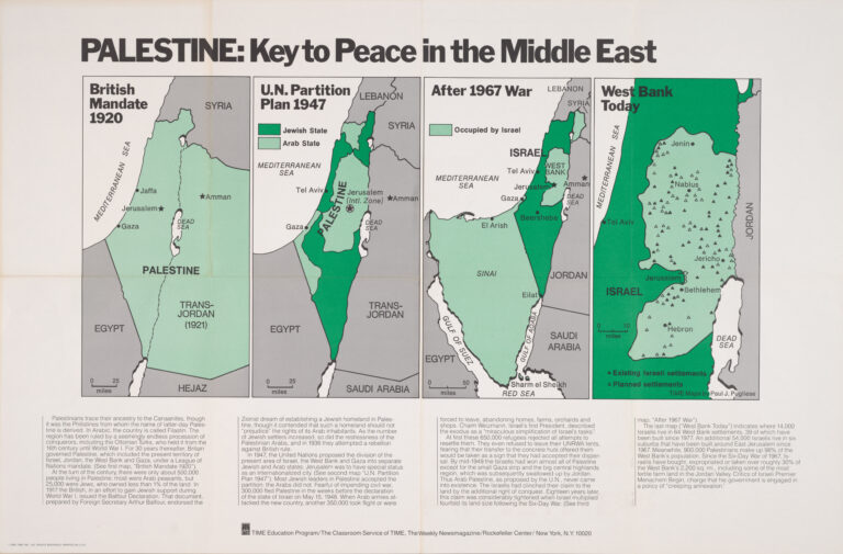 This series of maps, along with the accompanying text at the bottom, was intended to provide American teachers with perspective on the conflict between Israel and Palestine, providing historical data that explained how the current situation (in 1980) had come about.