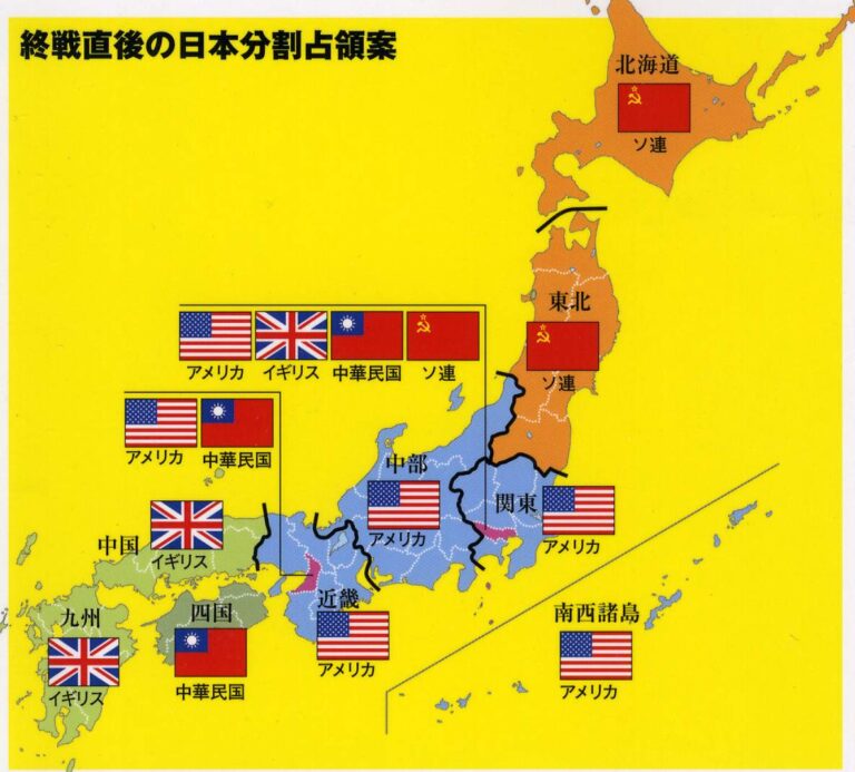 This map represents the proposal that was on the table regarding the possible partition of Japan at the end of the Second World War into territories controlled by different powers, something similar to what did happen in Germany and, in a less planned manner, in Korea.