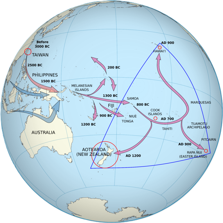 This map, created in 2008 by David Andrew Eccles for Wikimedia Commons, shows the migration routes of the first peoples who colonised the Pacific Ocean.