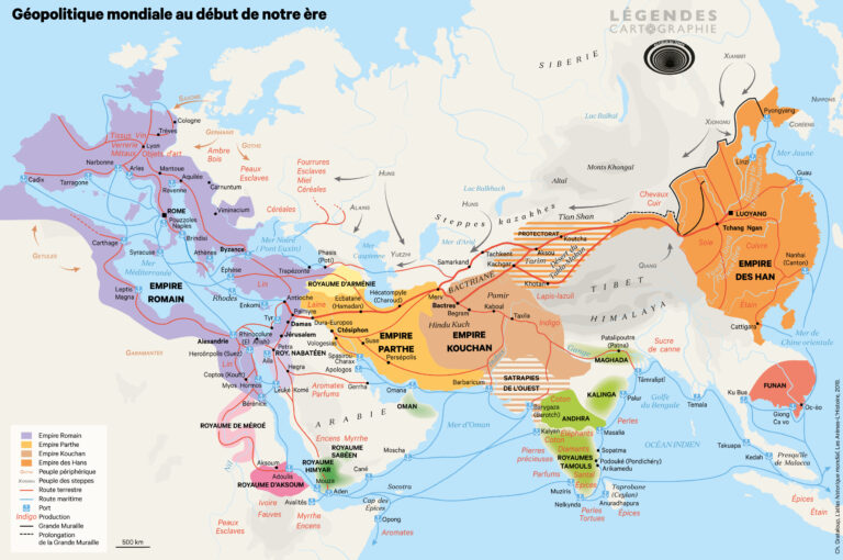 This map, published by Christian Grataloup as part of The Historical World Atlas in 2019, shows the geopolitical situation of the ancient world in the 1st century.