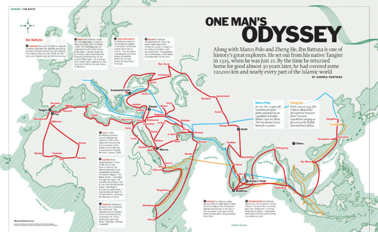 This map, created by Heather Jones, was published in summer 2011 as part of a special feature in the magazine. Time about Islam. It shows all the journeys made by Ibn Battuta throughout his life.