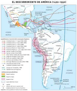 - In green, the third voyage (1498–1500). He left Spain with six ships and 226 people. The voyage included landings in Trinidad, Margarita (Venezuela) and Hispaniola.