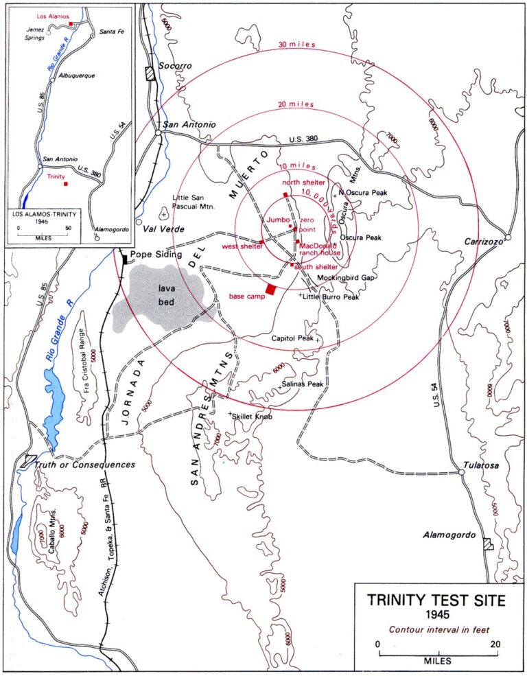 This site was chosen on 7 September 1944. On the map, in the upper left corner, you can see the distance to the Los Alamos test site, a town created to house the scientists working on the Manhattan Project. The rest of the map shows the terrain and structures located at various distances from the test site.