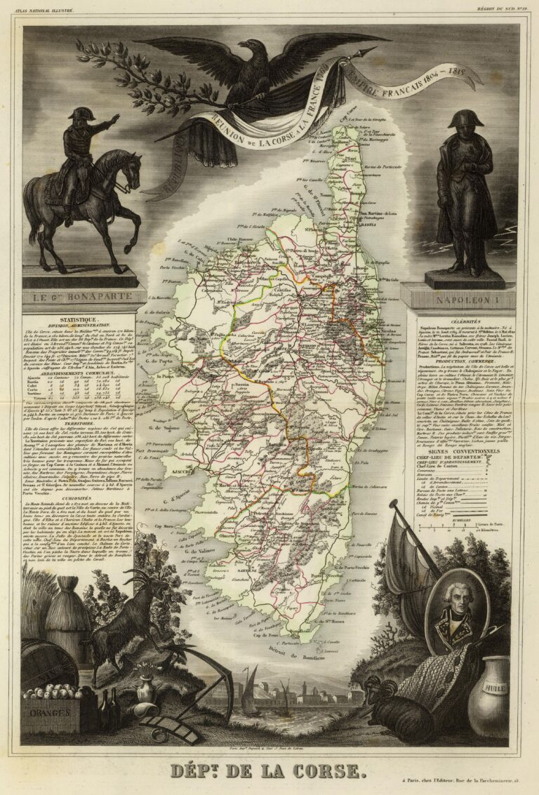 The representation of the island is accompanied by several illustrations, which are repeated on all the maps in the atlas. The two illustrations at the top show Napoleon Bonaparte, leader and emperor of France between 1799 and 1815. The one at the bottom right shows Pasquale Paoli, considered by Corsican nationalism to be the father of the nation. Finally, at the bottom left, you can see the region's most important commercial products.