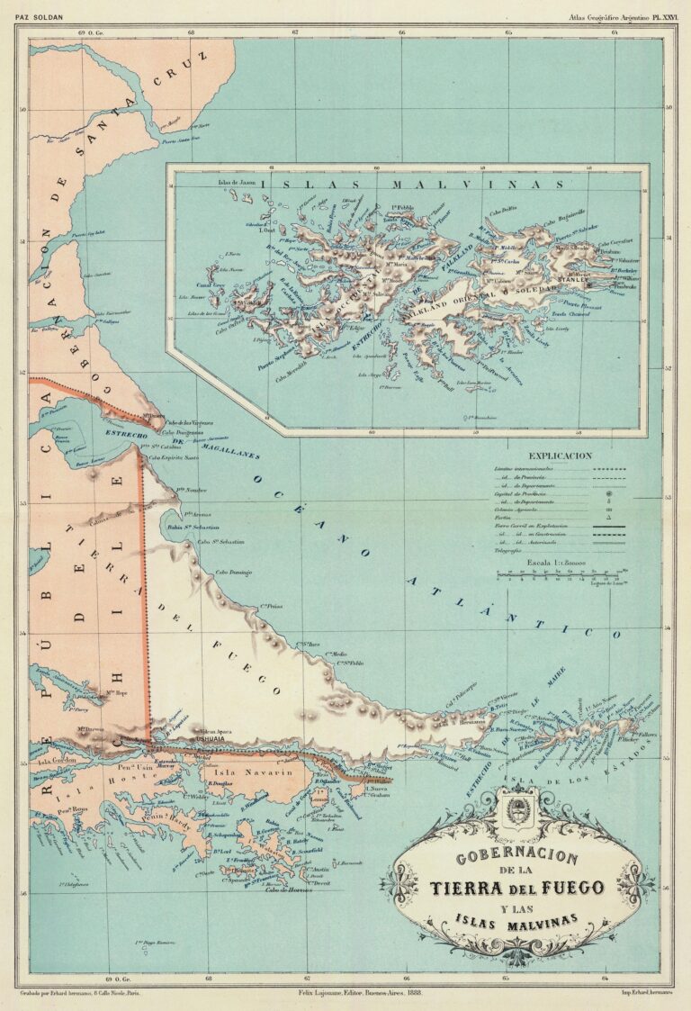 The map shows the province of Tierra del Fuego, as defined on 16 October 1884, reflecting the agreement reached between Argentina and Chile to divide Patagonia in a treaty signed in 1881. Although this map groups Tierra del Fuego and the Falkland Islands together, the Tierra del Fuego province did not officially include the Falkland Islands until 1904, even though this archipelago had been occupied by the British Empire since 1833.