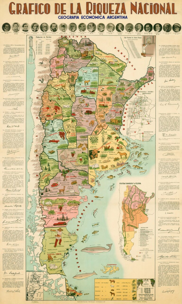 At the top are all the presidents of Argentina, from Bernardino Rivadavia to Agustín Pedro Justo, who was president when this map was published. In addition, on both sides are statements from ministers and governors on Argentina's economic situation and what steps can be taken to improve it.