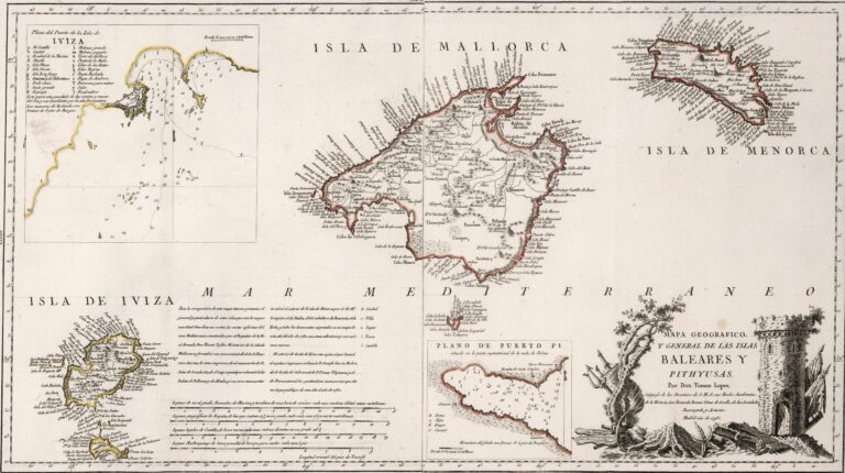 This map was created by Spanish cartographer Tomás López de Vargas Machuca in 1772 and published posthumously by his sons in the “Geographical Atlas of Spain” from 1804. The map depicts the Balearic Islands with the territorial boundaries prior to Javier de Burgos' provincial administration reform in 1833.