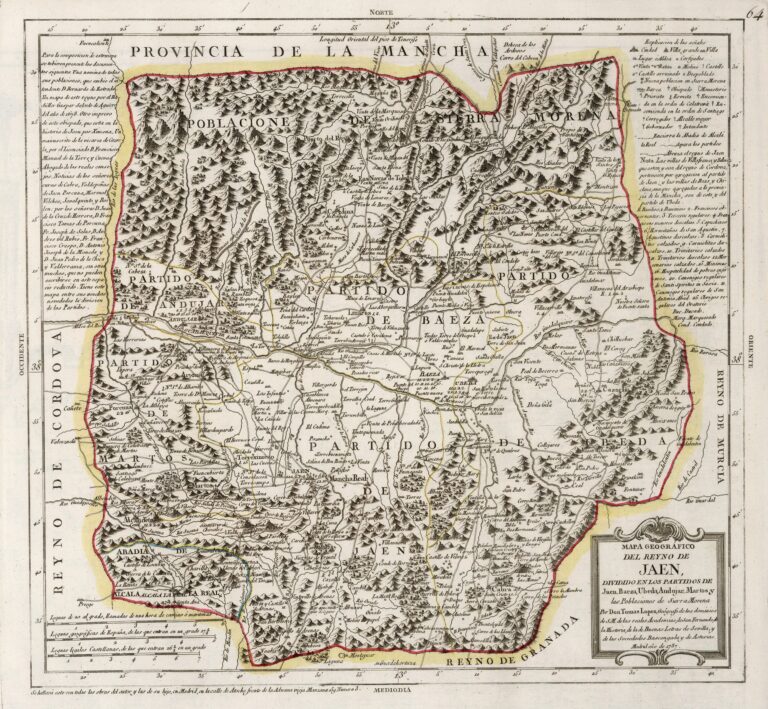 This map was created by Spanish cartographer Tomás López de Vargas Machuca in 1787 and published posthumously by his sons in the “Geographical Atlas of Spain” from 1804. The map depicts the Kingdom of Jaén with the territorial boundaries prior to Javier de Burgos' provincial administration reform in 1833.
