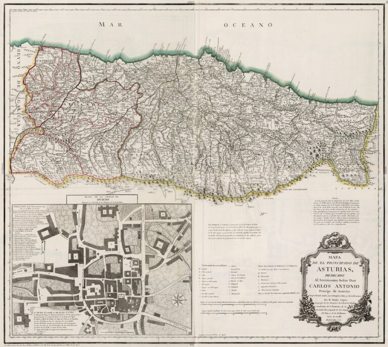 The Principality of Asturias bordered the Kingdom of Galicia, as shown on the map, in addition to the Staff of Laredo and the Province of Liébana to the east and the Province of Palencia to the southeast. To the south was the Province of León, However, as the author points out in a text in the centre of the map, the Principality of Asturias was administratively part of the Province of León, at least since 1750, as documented in the Catastro de Ensenada (Ensenada Cadastre).