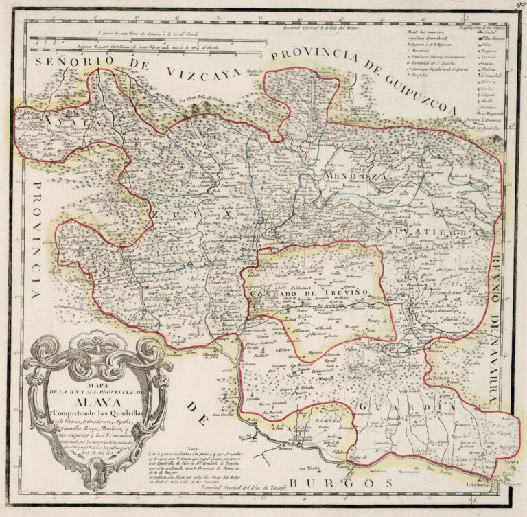 This map was created by Spanish cartographer Tomás López de Vargas Machuca in 1770 and published posthumously by his sons in the “Geographical Atlas of Spain” from 1804. The map depicts the Province of Álava with the territorial boundaries prior to the provincial administrative reform carried out by Javier de Burgos in 1833.